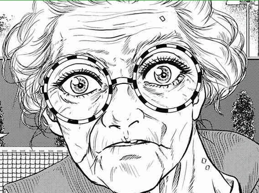 She looked like a fragile, thin old lady. However, her looks easily deceived Kintaro as she easily overwhelmed him. She wears large circular glasses with a pattern of white and black dashes.