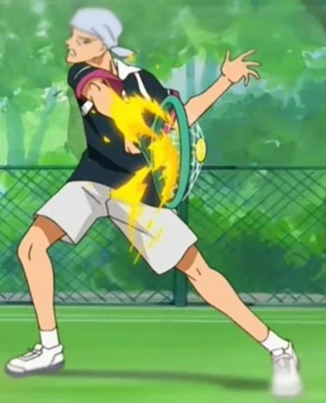 However, during his Semi-Finals match against Rikkai Daigaku Fuzoku, the 1st seed team in the Regionals and Nationals, he played Doubles 1 with Sakurai against the gentleman Yagyū Hiroshi and defense specialist Jackal Kuwahara. Here, Tetsu's Hadokyū is returned as if it was nothing by Yagyū as a drop shot and they suffer a humiliating 0-6 defeat and Fudomine goes on to lose the match, with only Tachibana being able to pull a single game from them.